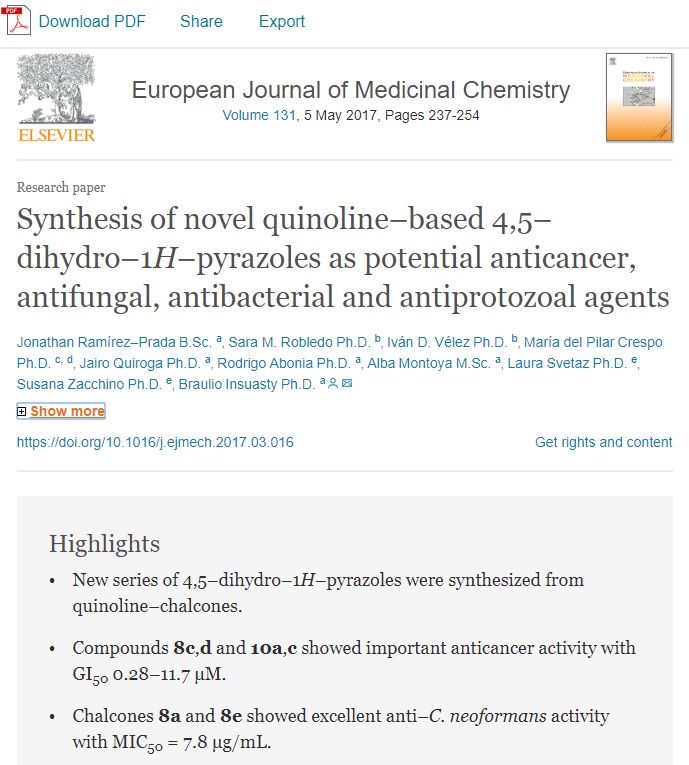 Quinoline, Chalcones, 2–pyrazolines, Anticancer activity, Antifungal activity, Antibacterial activity, Antimalarial activity, Antitrypanosomal activity, Antileishmanial activity