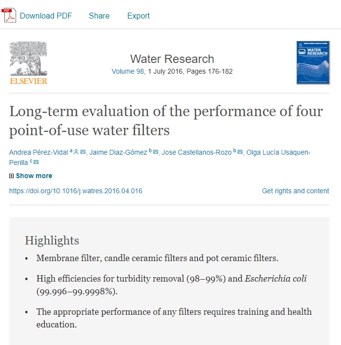 Despite technological advances water supply quality and poor access to safe water remain a major problem in developing countries, especially in rural areas. Point-of-use (POU) water treatment has been shown to be a viable option to produce safe drinking water quality. The aim of this study was to evaluate, under laboratory conditions over 14 months, the performance of four household filtration systems: membrane filter (MF), one-candle ceramic filter (1CCF), two-candle ceramic filter (2CCF) and pot ceramic filter (PCF). The evaluation was made using spiked water having the required concentrations of turbidity, Escherichia coli and Total Dissolved Solids (TDS). The results show that all systems have high removal efficiencies for turbidity (98–99%), and E. coli 4–5 Log Reduction Value (LRV). The poorest efficiency was for TDS (9–18%). The MF and the CCF displayed no significant difference in efficiencies for these parameters. The PCF had less significant differences for turbidity removal than the other systems. The average filtration rate for all systems decreased during the operation time. The CPF showed the major potential to be used in rural communities mainly for its low operational level and maintenance requirements as well as its local craftsmanship. It was observed that the efficiency of the systems is highly sensitive to cleaning and maintenance activities and therefore, the system sustainability will depend considerably on the training and education of the potential users.