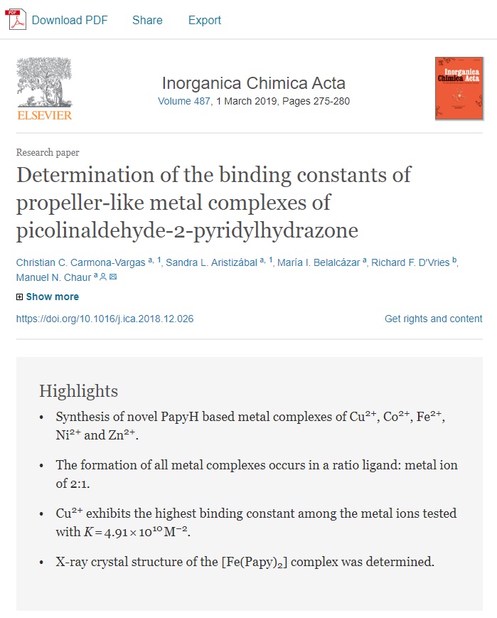 Herein, we determined the binding constants for transition metal complexes of Cu2+, Co2+, Fe2+, Ni2+, and Zn2+ ions formed with the ligand picolinaldehyde-2-pyridylhydrazone (PapyH) using the Benesi-Hildebrand method. Stoichiometry 2:1 (ligand: metal) was previously determined by the Job’s method and confirmed by single-crystal X-ray diffraction finding a propeller-like structure of the [Fe(Papy)2] compound. PapyH and the metal complexes were characterized by 1H NMR and UV-Vis spectroscopy, respectively. The Cu2+ complex exhibited the highest stability constant, which was confirmed by competitive reaction of different metal ions with the ligand PapyH.