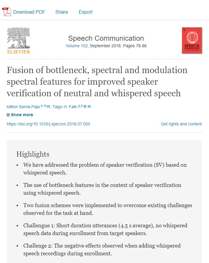 | dc.description.abstract | Speech based biometrics is becoming a preferred method of identity management amongst users and companies. Current state-of-the-art speaker verification (SV) systems, however, are known to be strongly dependent on the condition of the speech material provided as input, and can be affected by unexpected variability presented during testing, such as with environmental noise or changes in vocal effort. In this paper, SV using whispered speech is explored, as whispered speech is known to be a natural speaking style with reduced perceptibility but containing relevant information regarding speaker identity and gender. We propose to fuse information from spectral, modulation spectral and so-called bottleneck features computed via deep neural networks at the feature- and score-levels. Bottleneck features have been recently shown to provide robustness against train/test mismatch conditions and have yet to be tested for whispered speech. Experimental results showed that relative improvements as high as 79% and 60% could be achieved for neutral and whispered speech, respectively, relative to a baseline system trained with i-vectors extracted from mel frequency cepstral coefficients. Results from our fusion experiments, show that the proposed strategies allow to efficiently use the limited resources available and to result in whispered speech performance inline with that obtained with normal speech. | es |